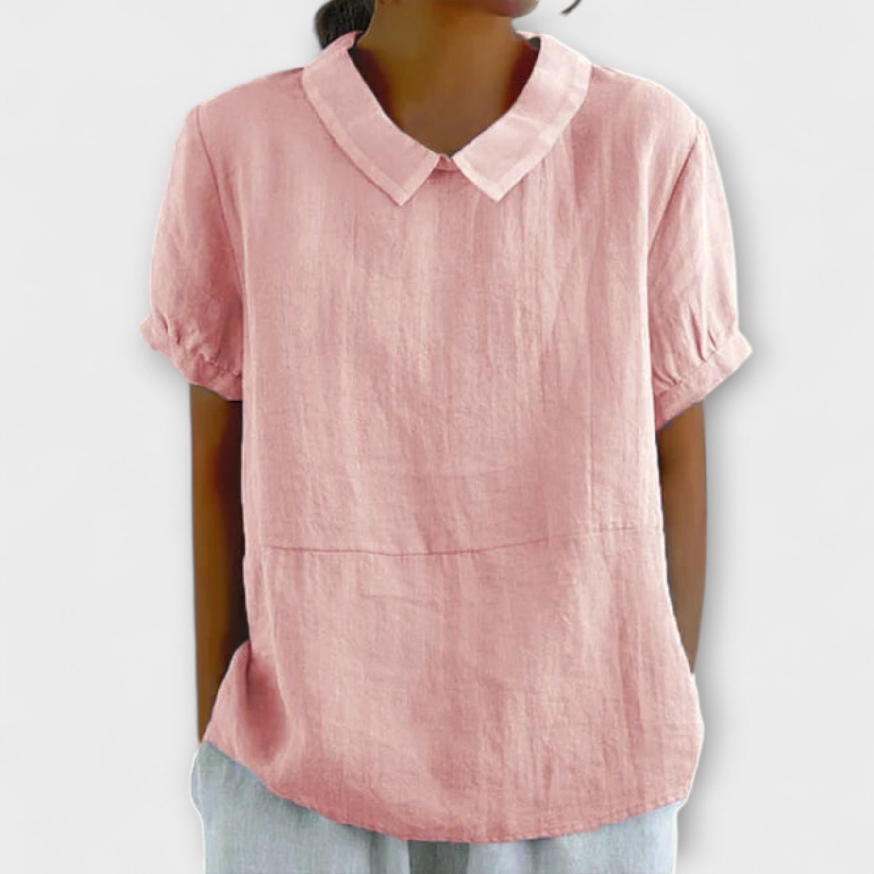 Esta blusa de lino ligero y transpirable destaca por su diseño holgado que ofrece comodidad durante todo el día. El material suave y aireado es ideal para días cálidos y se siente agradablemente fresco sobre la piel.