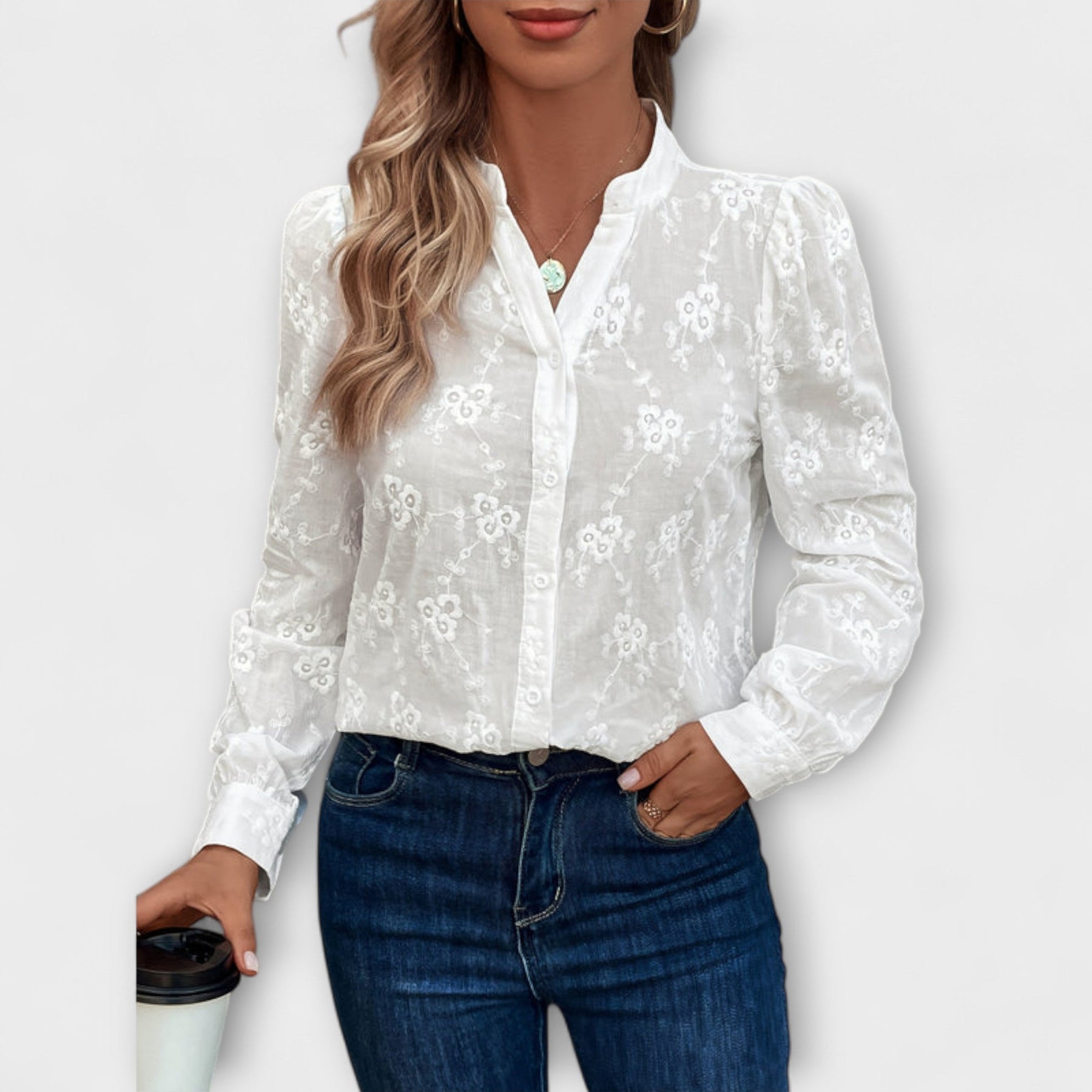 Esta elegante blusa de dama con fino bordado y acentos de encaje le da a tu atuendo un toque femenino y estiloso. Fabricada en algodón de alta calidad, combina comodidad ligera con detalles refinados, ideal para primavera, verano y otoño, ya sea en el día a día o en ocasiones especiales.