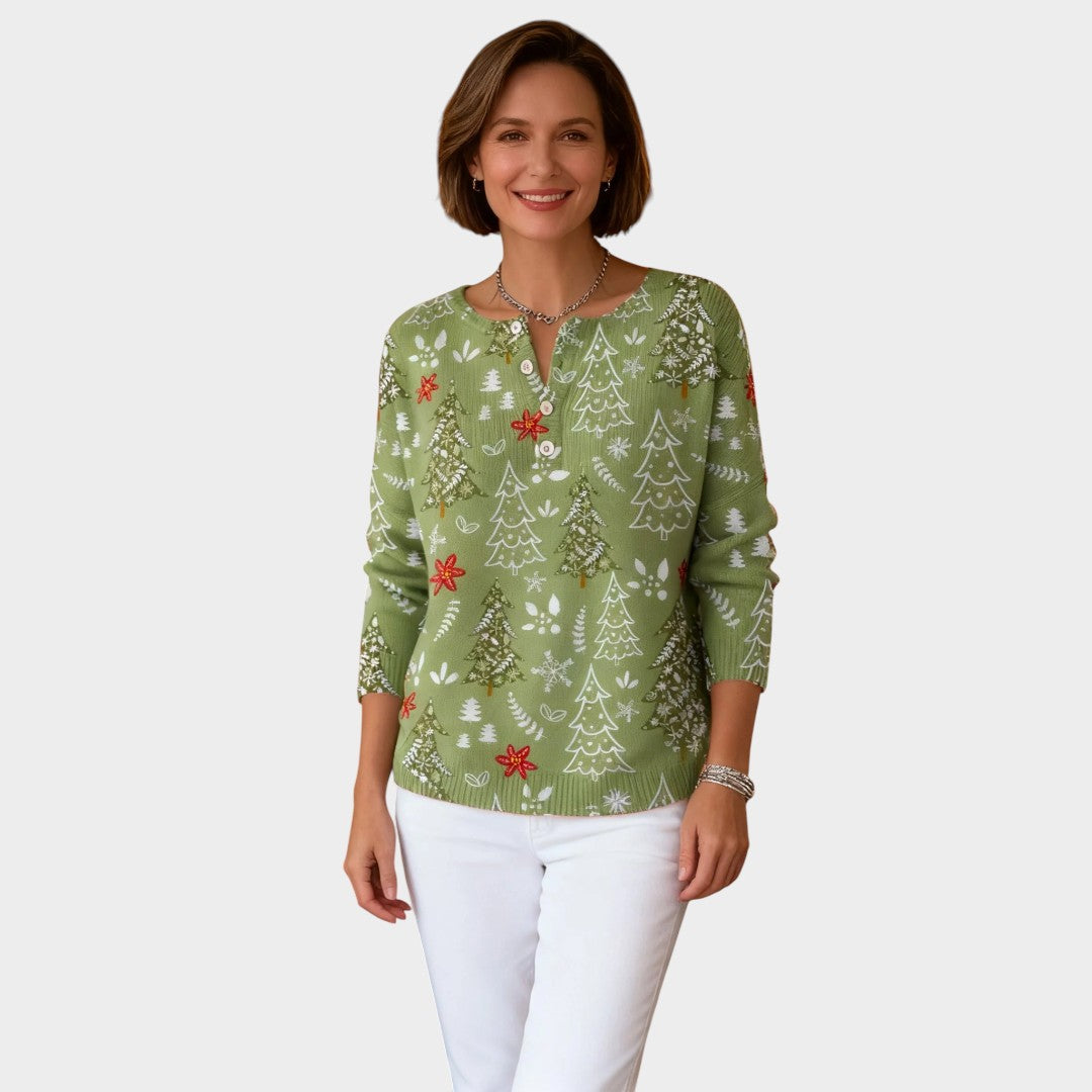Ovaj džemper donosi veselu božićnu vibru svojim svježim ružičastim i zelenim printom bora. Kombinacija mekih boja i suptilnih pruga daje moderan zaokret klasičnom blagdanskom izgledu. Izrađen od tople, pletene mješavine pamuka za vrhunsku udobnost.