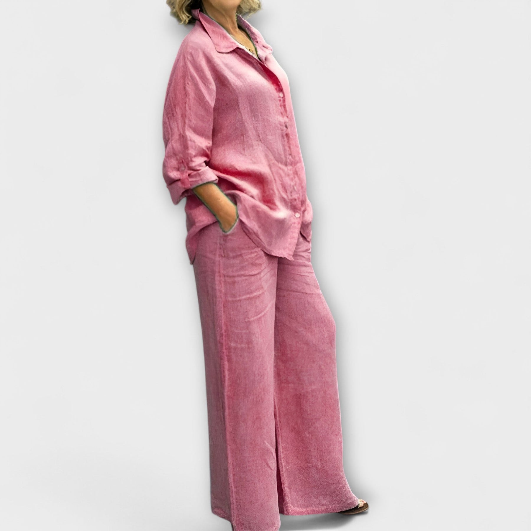 El conjunto de lino de Enza combina una relajada ligereza con una elegante sofisticación. La camisa de corte holgado y los pantalones de corte amplio ofrecen una sensación de uso aireada y se pueden combinar de diversas maneras. Perfecto para ocasiones informales o días relajados en clima cálido.