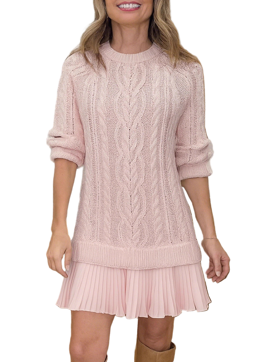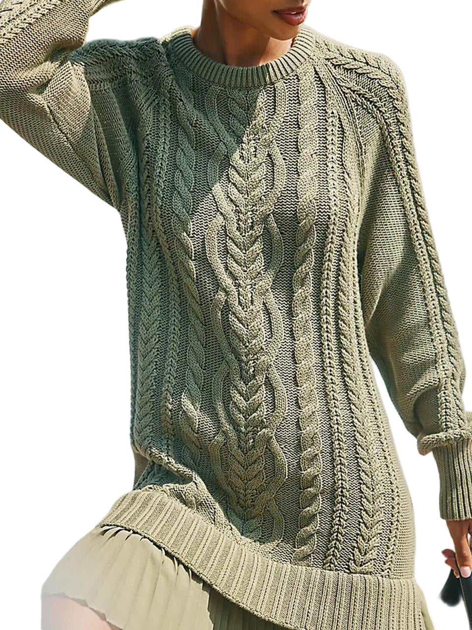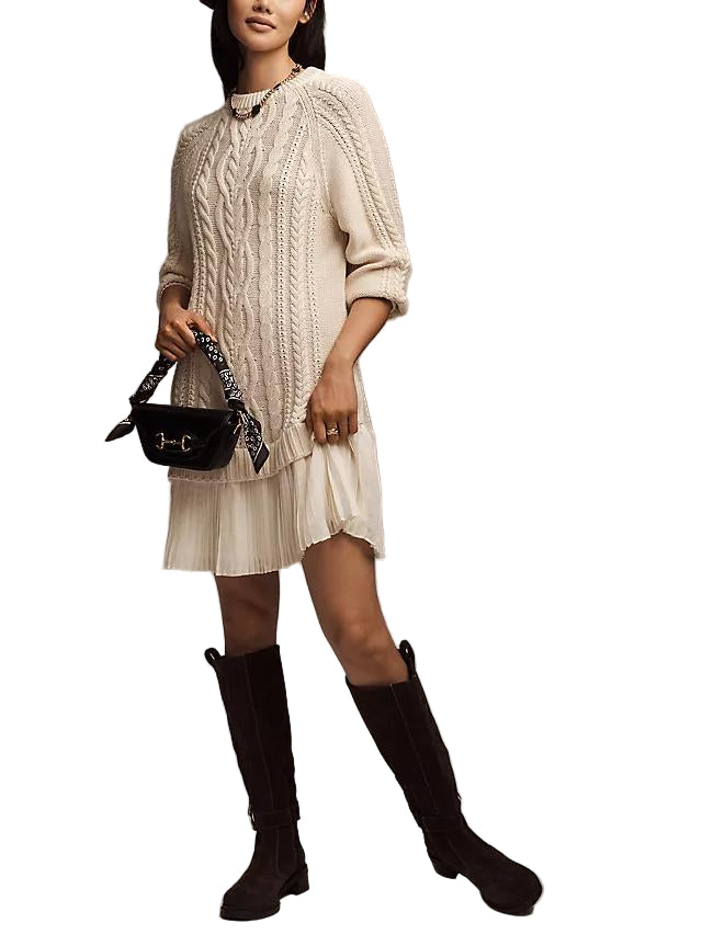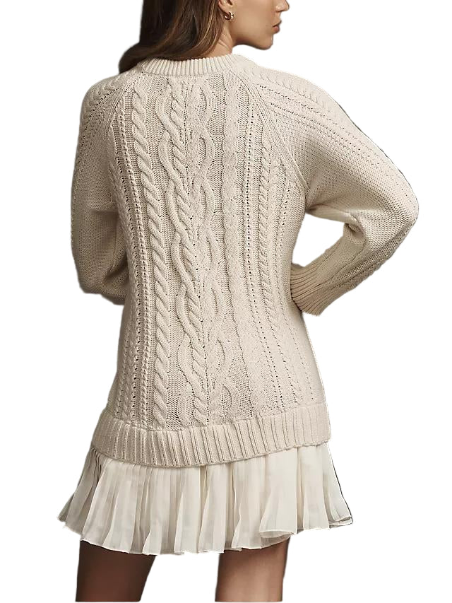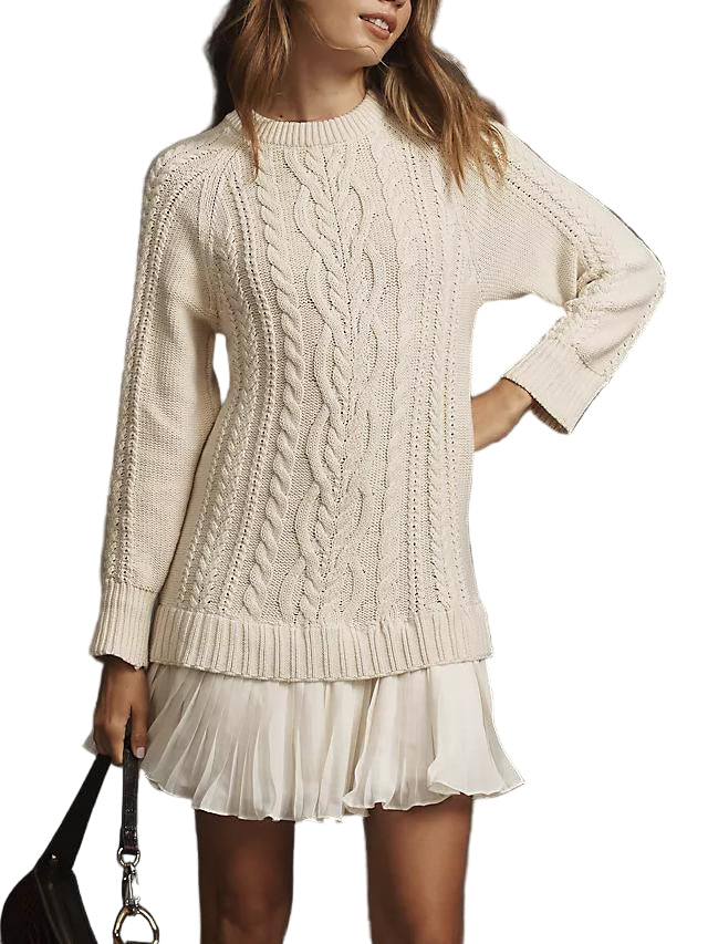 Ova pletena mini haljina spaja udobnost i moderan stil. Izrađena od mekane pletene tkanine, ima gornji dio u stilu pulovera koji pruža toplinu, a pritom izgleda elegantno. Mini duljina dodaje dašak zaigranosti, čineći je laskavom i svestranom za svaku priliku.