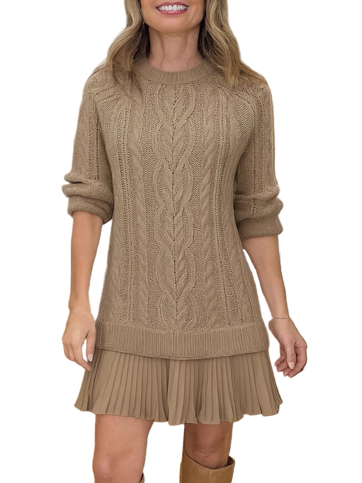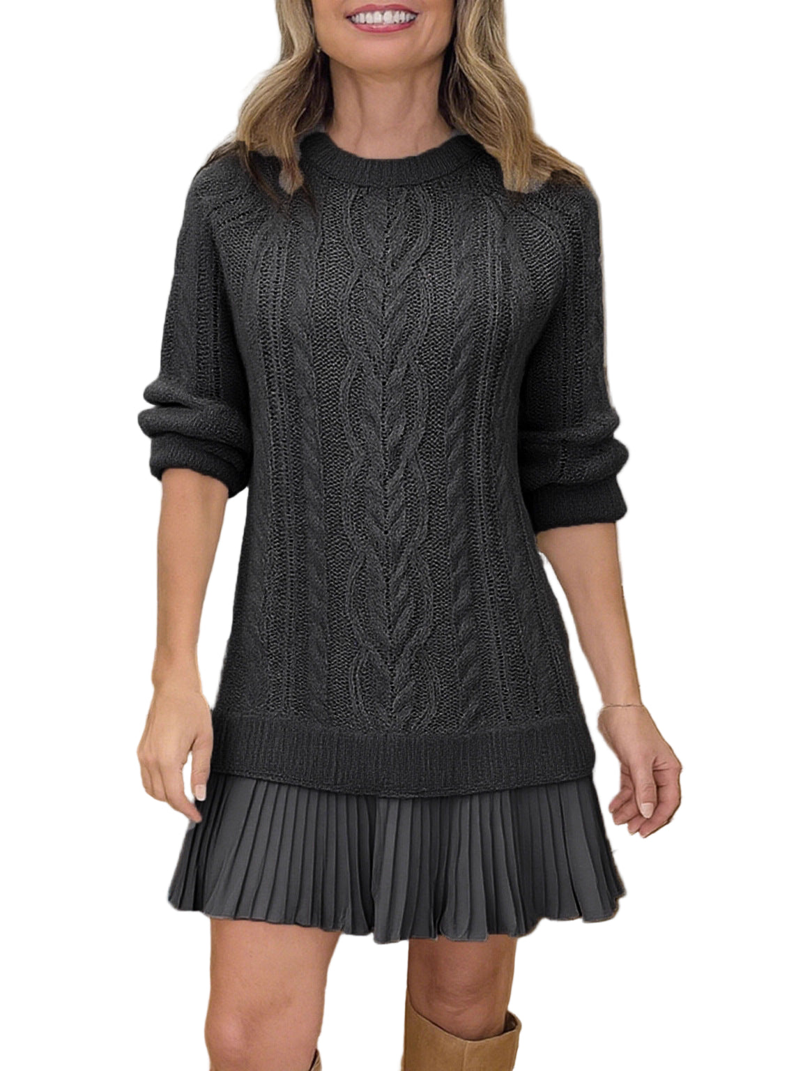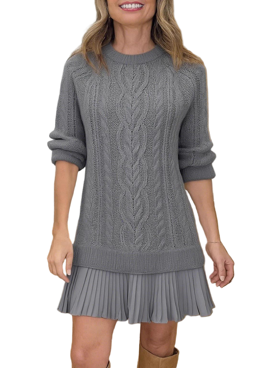 Ova pletena mini haljina spaja udobnost i moderan stil. Izrađena od mekane pletene tkanine, ima gornji dio u stilu pulovera koji pruža toplinu, a pritom izgleda elegantno. Mini duljina dodaje dašak zaigranosti, čineći je laskavom i svestranom za svaku priliku.
