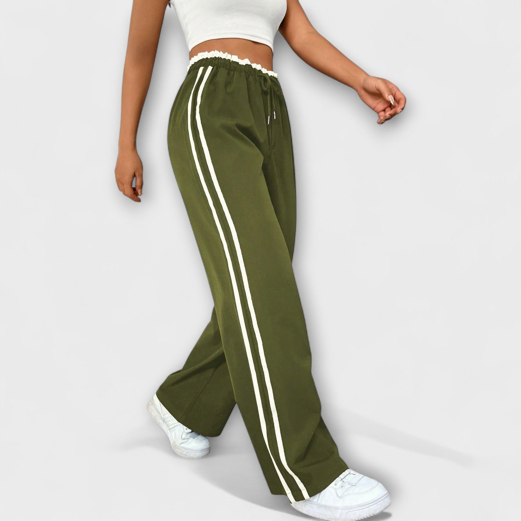 El pantalón Yara combina una tendencia casual con un alto confort de uso. Las marcadas franjas dobles en los lados añaden acentos deportivos, mientras que la cintura elástica con cordón asegura un ajuste perfecto.
