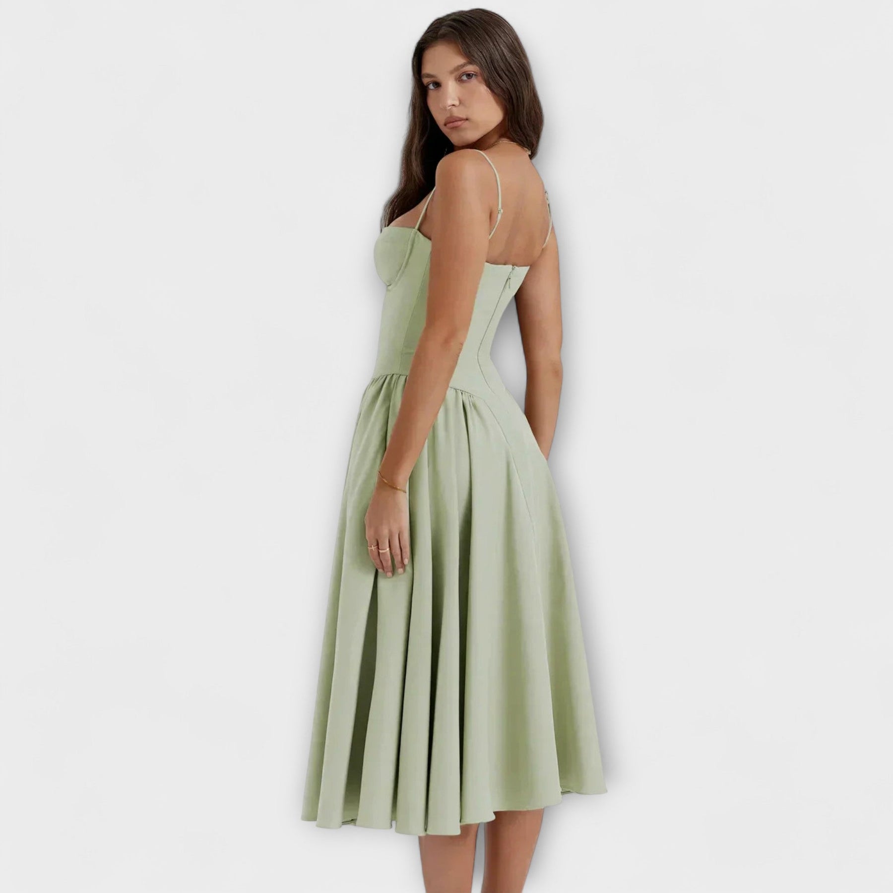 La elegancia se encuentra con la confianza: este sofisticado vestido de corsé de Gemma impresiona con su diseño sin mangas y su ajuste ceñido. Resalta tu silueta a la perfección y añade un toque de estilo a tu look, ideal para mujeres con un sentido de la moda exigente.